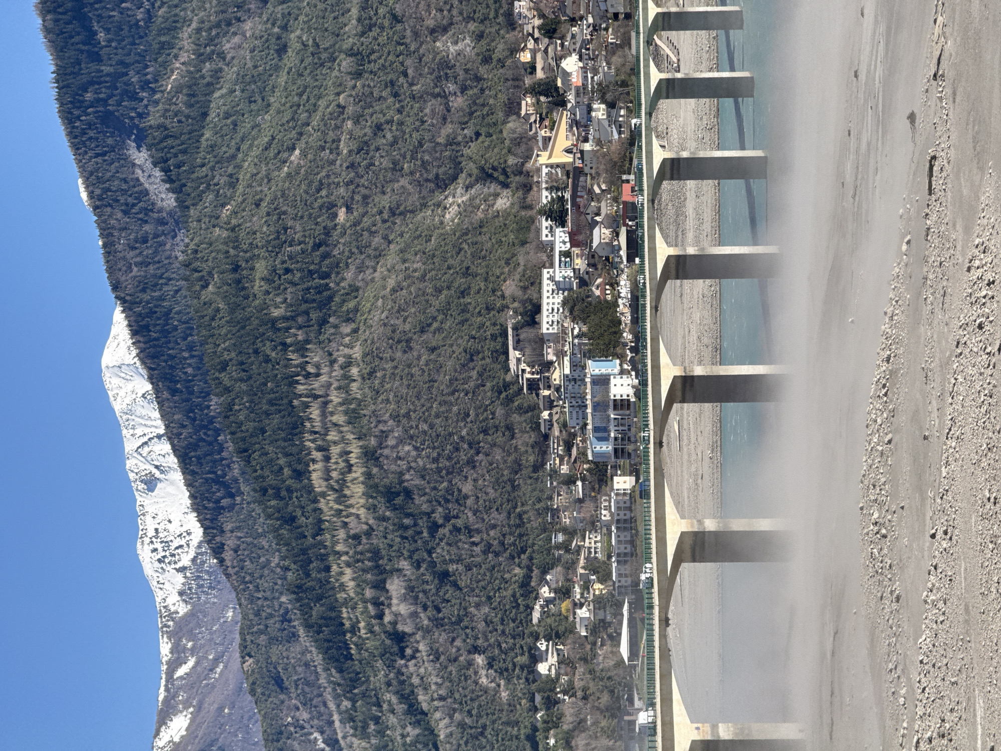 landscape featuring a mountain partially covered in snow, a dense forest, the town of Savines-le-Lac, France, and a bridge. The town is nestled along the edge of the forest, bordering a river. The bridge spans the river and appears to be constructed of concrete. The riverbed is visible and appears largely dry. The sky is clear blue in the upper left corner. The photo seems to have been taken from an elevated vantage point.