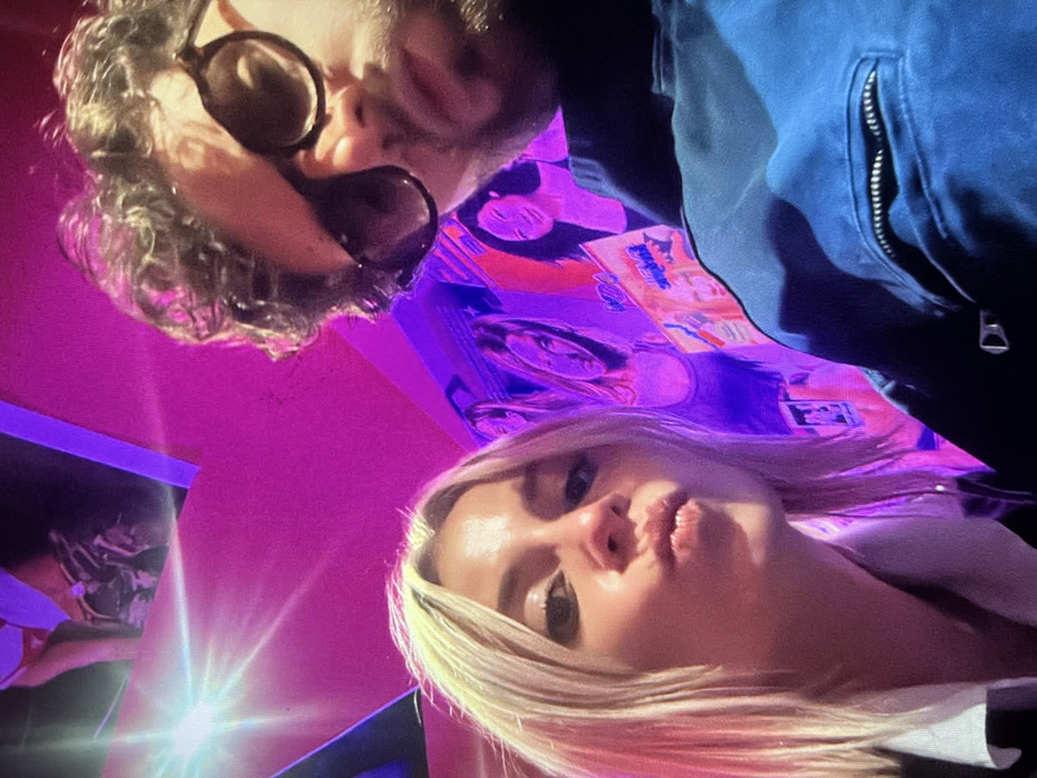 A selfie of a man and woman looking down at the camera. The man has curly brown hair, a beard, and round sunglasses. He wears a blue jacket. The woman has long blonde hair with pink tips and is pouting her lips. They appear to be inside a room with purple and pink lighting. There are posters or artwork visible in the background, which may be a television or artwork hanging on the wall. A flash glare appears in the lower left corner of the image.