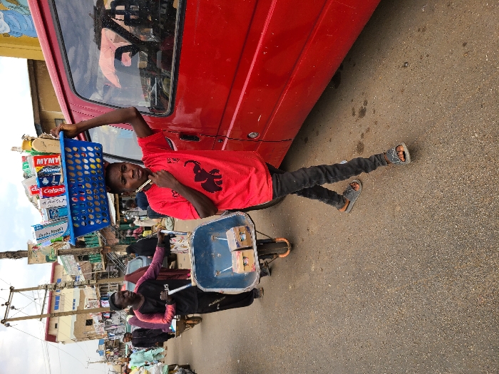 The image captures an outdoor urban street scene in the city of Unknown, Unknown. In the immediate foreground, a young male wearing a red short-sleeved t-shirt with a dark elephant logo and dark, tight-fitting trousers, along with dark sandals, carries a blue plastic basket filled with assorted packaged consumer products, including toothpaste (e.g., Colgate, MyMy) and lotions, balanced on his head. His left hand is raised, providing support to the basket. His right hand holds a light-colored object near his chin, and he is looking directly forward. To his left, another male in a black long-sleeved shirt and dark trousers pushes a blue wheelbarrow containing two small, light-colored boxes. A red van with dark windows occupies the right side of the frame, positioned alongside the foreground male. The background reveals a bustling street with multiple pedestrians, some wearing traditional attire and head coverings. Overhead, utility poles with numerous power lines and cables are visible, extending above multi-story buildings that line the street. The road surface is asphalt. The scene is illuminated by daylight.