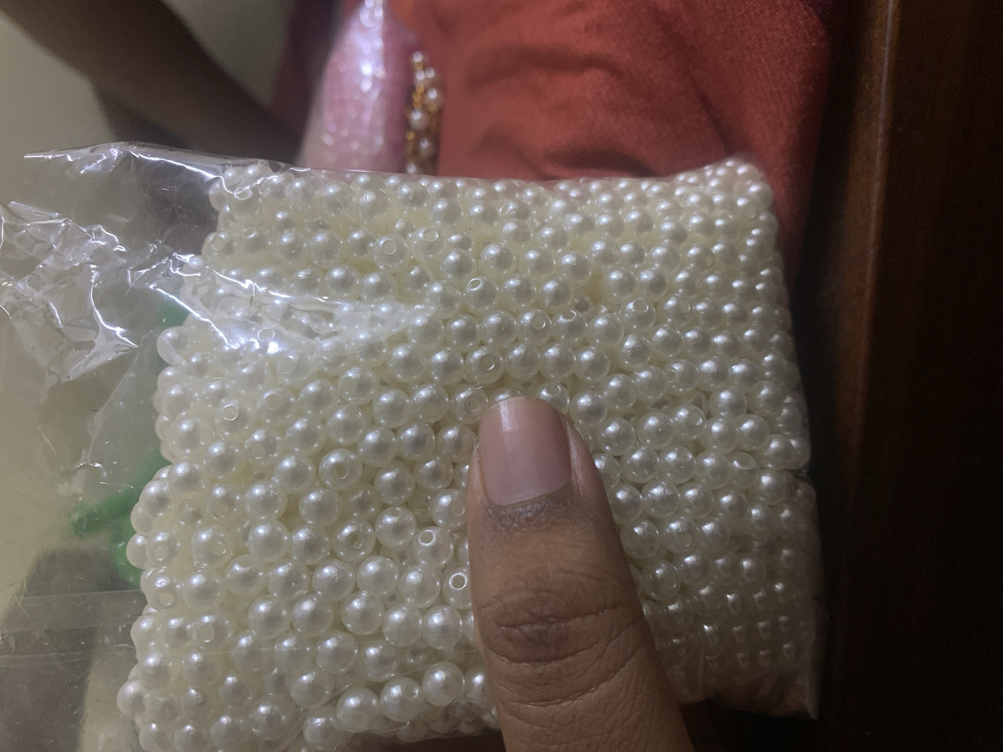 A person holds a plastic bag filled with numerous white beads in Dar es-Salaam, Tanzania. The bag is partially transparent, revealing the dense accumulation of beads within. A thumb rests on the surface of the bag, partially obscuring the beads. In the background, an out-of-focus red fabric is visible. A hint of another bag with gold beads is present. A dark wooden surface or wall forms part of the background. The lighting appears to be artificial.