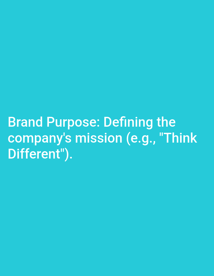 The image displays a solid teal background. White, sans-serif text is present, left-aligned in the lower half of the frame. The text reads: "Brand Purpose: Defining the company's mission (e.g., "Think Different").". No individuals, physical objects, actions, or interactions are depicted. The environment is limited to the flat, monochromatic background. The image provides no visual information to indicate a specific physical location, including the city of Mansehra, Pakistan.