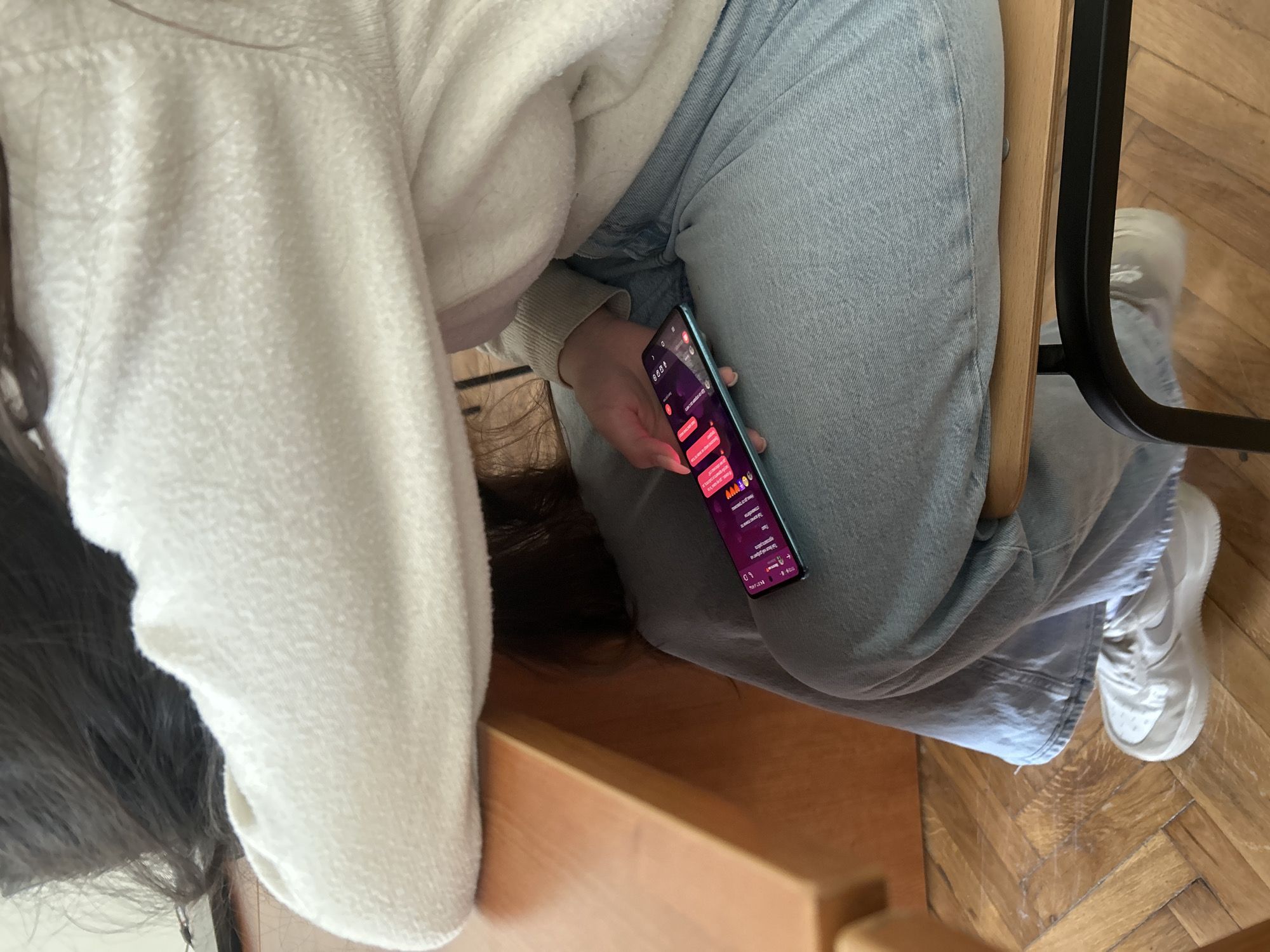 The image depicts an indoor scene within a classroom or educational facility in Sofia, Bulgaria. A person is seated, with their upper torso and head leaned forward, resting on a light brown wooden desk. The individual is wearing a white textured long-sleeved sweater, light blue baggy jeans, and white sneakers, specifically Nike Air Force 1s. The person's right hand holds a light blue smartphone, which displays a dark purple/pink user interface with multiple bright pink message bubbles, indicating an active messaging application. The phone screen is brightly illuminated and visible. A wooden chair with a black metal frame is partially visible in the lower right, and the floor features light brown parquet flooring.