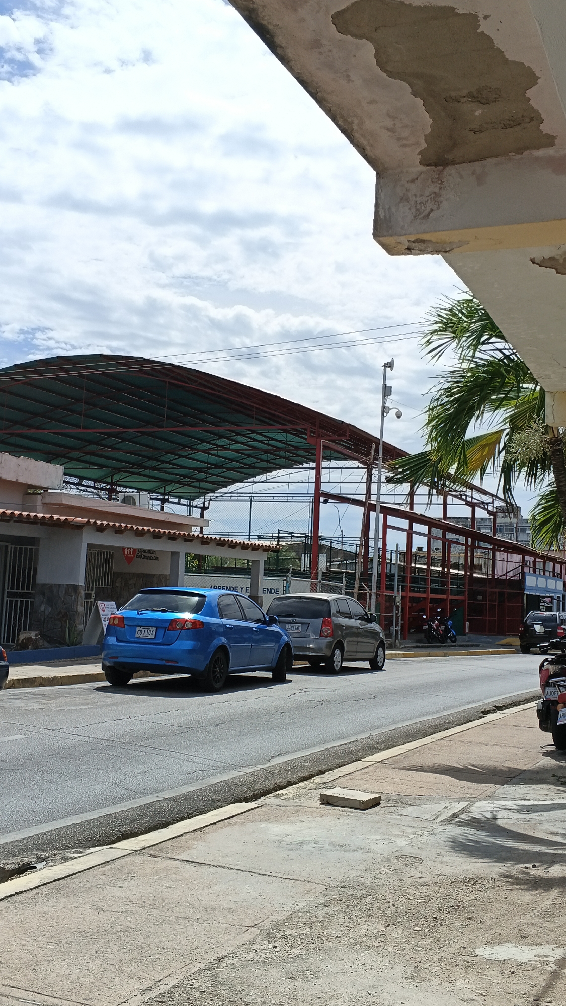 The image depicts a street scene in Juan Griego, Venezuela. Two cars, a blue hatchback and a gray compact car, are parked along the curb. A covered structure with a red metal frame and a green roof is visible in the background, possibly a sports facility or marketplace. A building is next to it with the words "Aprendiendo y Emprendiendo con Amor". Other parked vehicles, including a motorcycle, are partially visible on the right side of the frame. Overhead cables stretch across the sky above the covered structure. The sky is overcast. The sidewalk shows signs of wear and tear, with a rectangular concrete block placed on the surface. A palm tree is on the right.