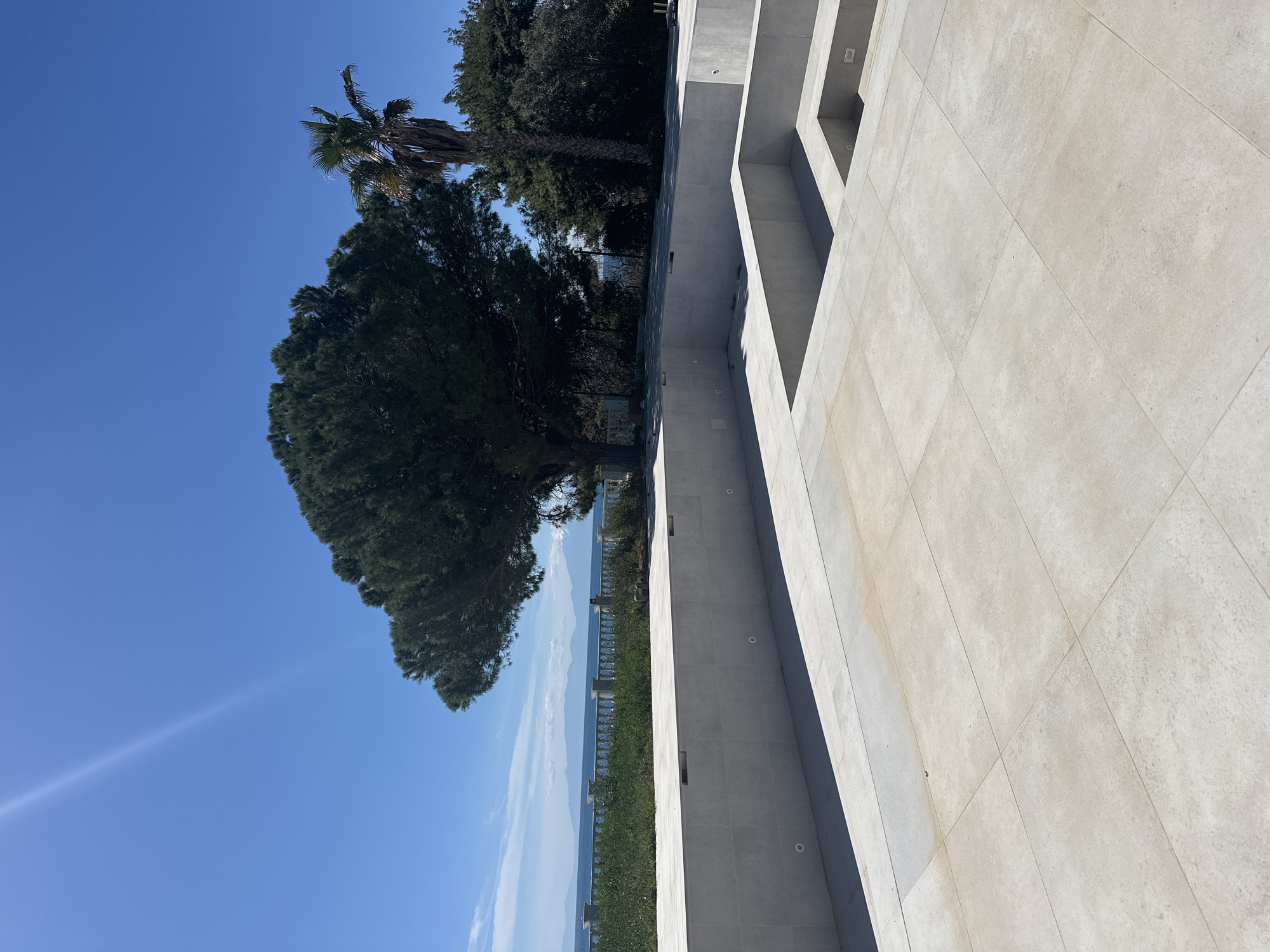 The image depicts a sunlit scene in Unknown, Greece. A clear blue sky is visible in the upper left corner, transitioning to a landscape featuring trees, possibly pines, and a palm tree. Further back, a body of water, possibly the sea, is visible, with a railing or barrier running along the shoreline. To the right, a modern, light-colored building with recessed windows or openings dominates the frame. The building's facade is constructed from large, square tiles, giving it a textured appearance. The scene appears to be captured from a slightly elevated perspective.
