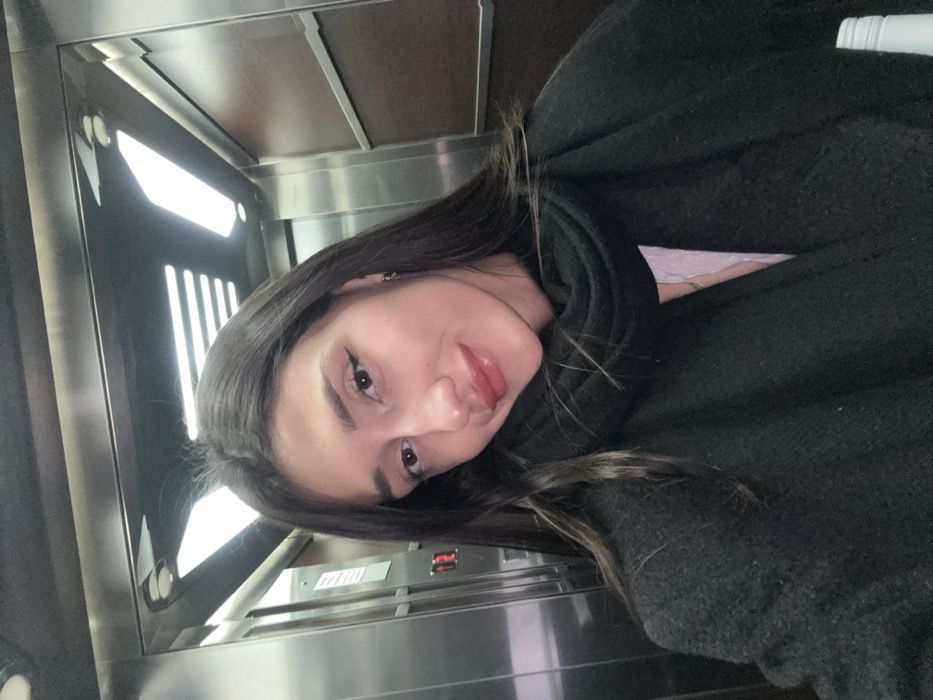 A female subject is photographed inside an elevator located in Donji Pobori, Montenegro. The individual, an adult female with long, dark hair, is positioned centrally in the frame, looking directly at the camera with a slight smile. She is wearing a black coat or jacket, a black scarf wrapped around her neck, and a light-colored garment is partially visible underneath. A small, dark earring is present on her left ear. The elevator interior features metallic panels on the left wall, which include a control panel with illuminated red buttons. The right wall is composed of brownish panels with horizontal metallic banding. Overhead, the ceiling displays multiple recessed, linear light fixtures emitting bright white light. A white bottle cap is partially visible in the bottom right corner of the image.