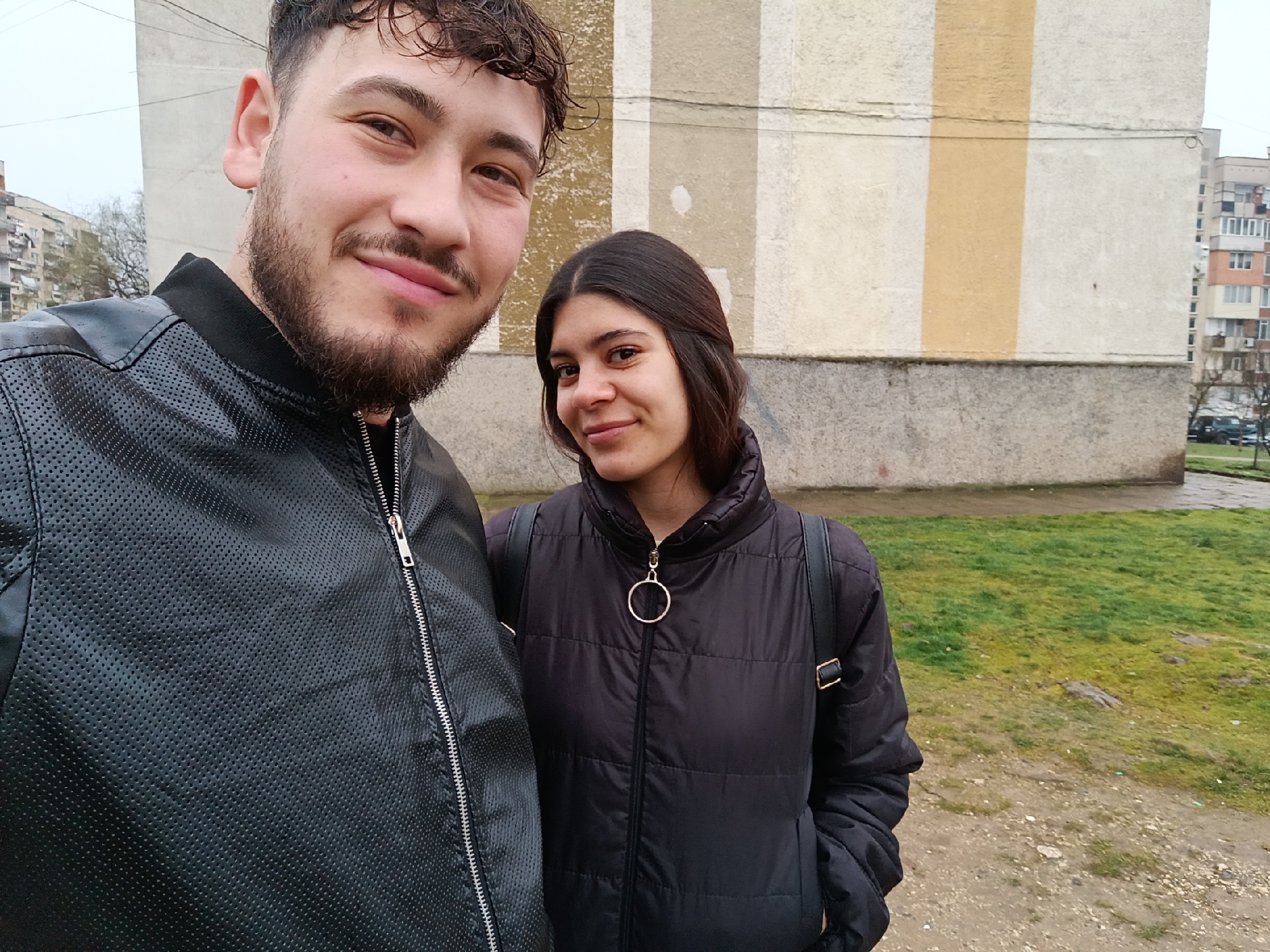 The image displays two young individuals, a male and a female, captured in a selfie-style photograph outdoors in the city of Roman, Bulgaria, under an overcast sky. The male, positioned on the left and closer to the camera, has dark, curly hair and a beard, and wears a black perforated leather jacket with a prominent silver zipper. He is smiling and looking directly into the camera. The female stands to his right, slightly further back, with long dark hair. She wears a black puffer jacket featuring a gold O-ring zipper pull and a black backpack with visible gold-colored buckles on its straps. She is also smiling faintly and looking at the camera. The immediate background features a multi-story building, likely a residential block, with a light-colored facade exhibiting a distinct vertical yellow-orange stripe and a darker, concrete-like base. Wires or cables are visible against this wall. In the mid-ground, the terrain consists of patchy, dull green grass interspersed with bare dirt and small stones. Further in the distance on the right, another multi-story residential building with balconies and windows is partially visible, along with some bare tree branches and a dark-colored vehicle.