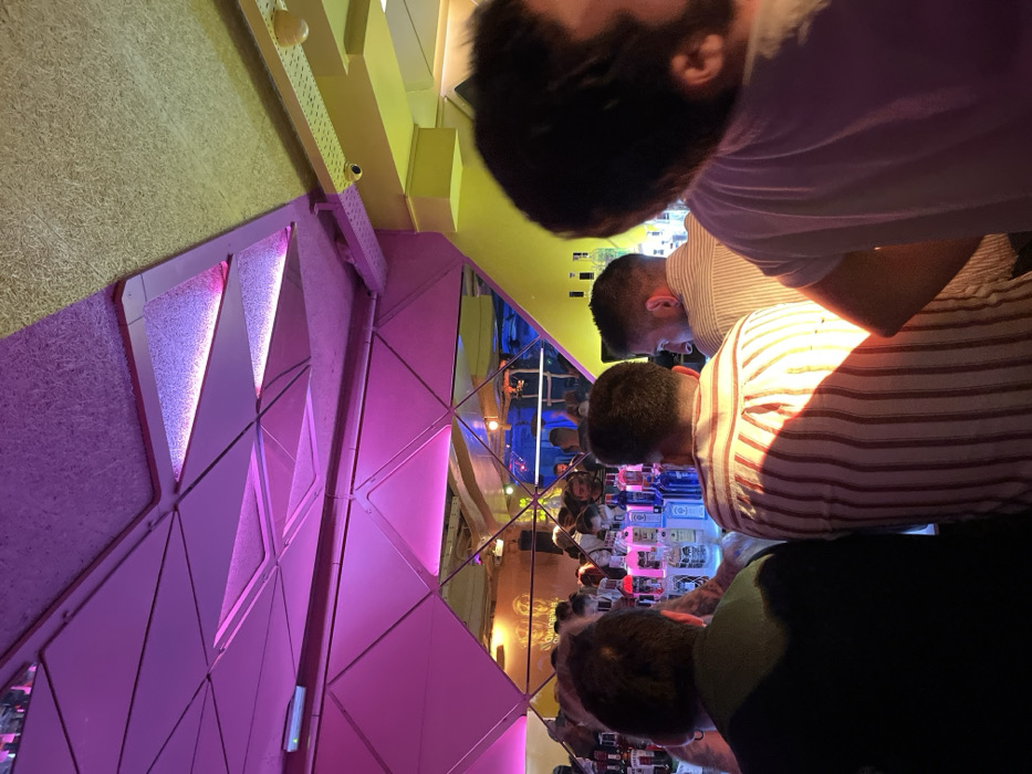 This image depicts an interior scene at Piccadilly Downtown Club, located in Valencia, Spain. The environment is a crowded bar or nightclub characterized by a distinctive modern geometric design and vibrant artificial lighting. The ceiling and upper walls feature a complex arrangement of triangular panels, some of which are reflective/mirrored, alongside textured acoustic panels in shades of magenta/pink and yellow/lime green. Integrated LED lighting within these panels emits a strong magenta glow. A light-colored structural beam and a visible conduit with a small security camera are present on the yellow-toned section of the ceiling/upper wall. In the mid-ground, three individuals, primarily men, are observed from behind or the side, standing at a bar counter. From left to right: one person wears a dark shirt and exhibits a visible tattoo on the left arm/shoulder; another wears a vertical red-and-white striped shirt, with a distinct orange light patch illuminating their back; the third wears a light-colored striped shirt. Bottles of various alcoholic spirits are visible on the bar surface in front of these individuals. A fourth, blurry individual with dark hair and a beard, wearing a white t-shirt, is partially visible on the far right, also facing the bar. Reflected in the mirrored panels and visible through an opening further back, a larger crowd of people is present, suggesting a busy social atmosphere. The overall scene is illuminated by dominant magenta and yellow lighting, creating high contrast and a dynamic ambiance.