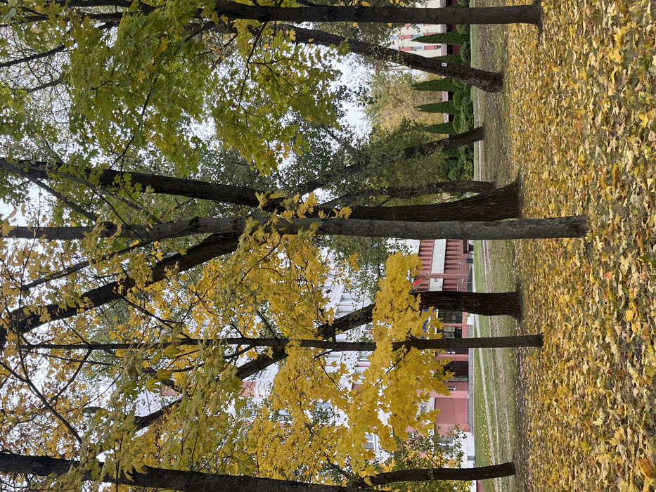This image depicts an autumn scene in a park area adjacent to the State Institution "Main Centre for Forensic Examinations of the Republic of Belarus" at vul