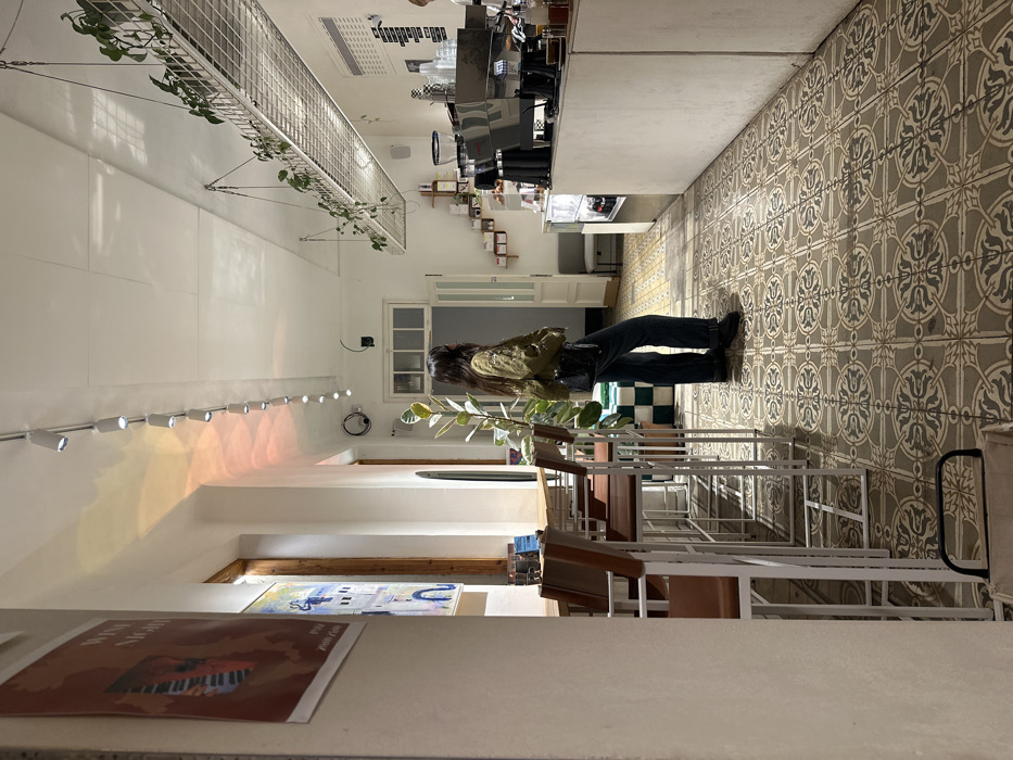 An interior shot shows a long, narrow space with patterned tile flooring. A woman stands near a doorway. To the left, track lighting runs along the wall. Tables and chairs are stacked near the bottom of the frame. Hanging plants adorn the ceiling. A counter runs along the right side, leading to a coffee preparation area in the background. Artwork is visible on the lower left.