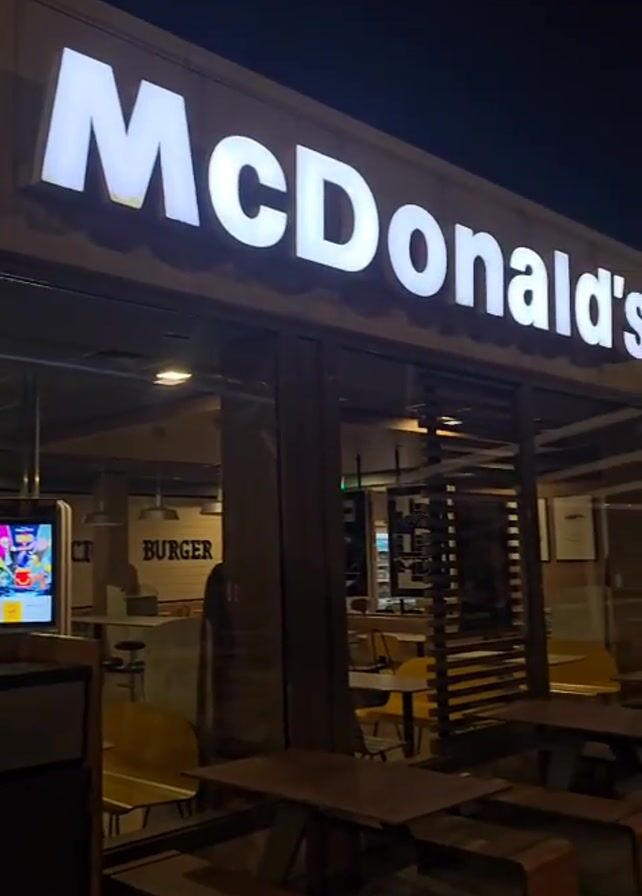 At night, a well-lit McDonald's restaurant stands adjacent to a gas station. The illuminated McDonald's sign is prominently displayed above the entrance. Tables and benches are arranged outside, seemingly unoccupied. Adjacent to the McDonald's is a gas station, marked with the Shell logo. The sky is dark, suggesting a late hour.