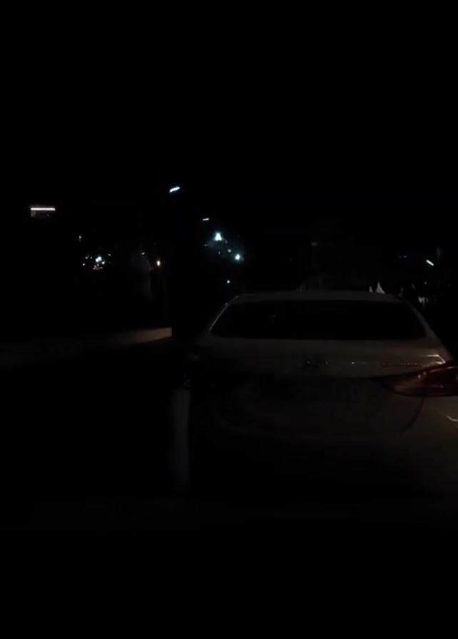 white Hyundai Elantra car parked on the side of a road at night. The street is lit by dim streetlights. The video begins out of focus and sharpens to reveal the car. A voice is heard saying "Show" in English. Someone replies with an unknown language but it sounds like they are agreeing.