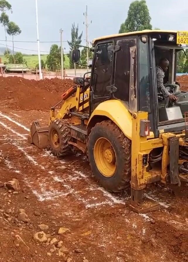The video depicts a yellow CAT backhoe in operation on a construction site. The backhoe is positioned on reddish-brown soil, and white lines are marked on the ground, likely indicating the boundaries of the work area. The backhoe’s operator, a person wearing a patterned shirt, is visible inside the cab. The backhoe arm and bucket are actively digging into the soil, scooping up earth. Trees and buildings are visible in the background, under a cloudy sky.