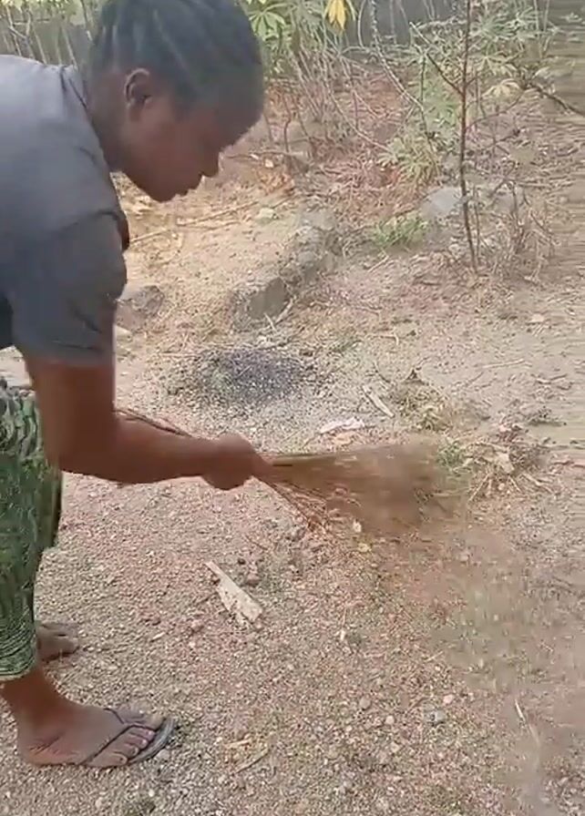 A person is using a bundle of twigs as a broom to sweep a sandy area littered with small debris