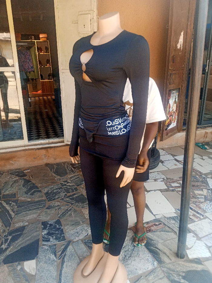 The scene depicts an outdoor commercial area in the city of Television, Nigeria. A headless, light-toned mannequin stands in the foreground, facing slightly left. It wears a black long-sleeved top featuring a central circular cutout secured by a silver ring, and black leggings. A black fanny pack displaying white repeated text "LOUIS VUITTON PARIS" is worn around its waist. The mannequin rests on a light brown, bulbous base. A dark-skinned individual, clad in a white t-shirt, dark shorts, and green-and-white flip-flops, stands partially obscured behind the mannequin's right side. Their right hand is visible adjacent to the mannequin's arm. To the left, a glass door with a white frame provides a view into a store, revealing a black-and-white checkered floor, clothing racks, and shelves. A white rectangular utility box is affixed to the tan wall above the glass door. To the right, a weathered brown wooden door is present, featuring an attached poster displaying an image of a person. A dark vertical pole is visible further right. The immediate ground is paved with irregular, dark-toned stone tiles, exhibiting black and grey marbling. Further to the right, the paving transitions to lighter, irregularly shaped tiles, some with discernible patterns. Two additional pairs of green-and-white flip-flops are on the ground in this lighter tiled area. The scene is illuminated by natural daylight.