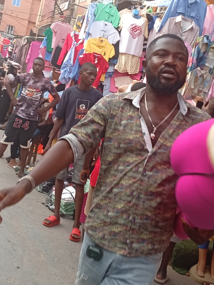 The scene depicts an outdoor street market in Nkwelle, Nigeria