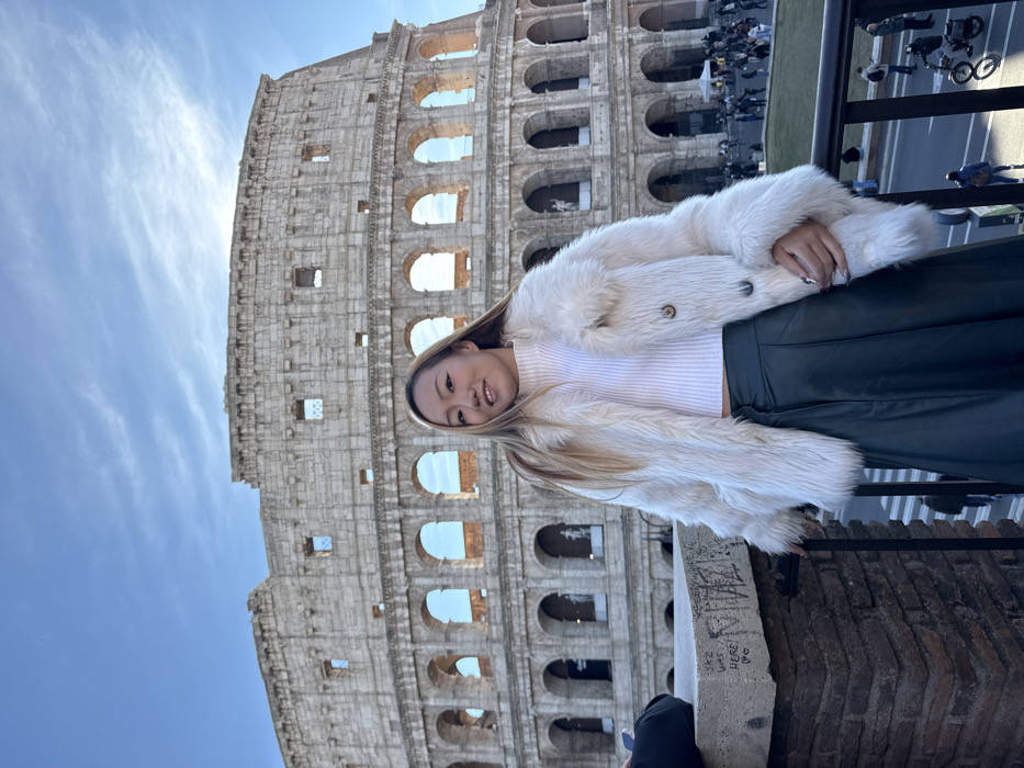A young East Asian woman poses for a photograph in Rome, Italy, with the Colosseum visible behind her