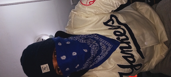 A person is wearing a black beanie and a blue bandana covering their face, with only their eyes visible. They are also wearing a cream-colored New York Yankees jacket. The jacket has a large "Yankees" logo in black lettering across the front and a smaller baseball logo on the sleeve. The background is a plain white wall. The image is slightly rotated, with the person appearing at a diagonal angle.