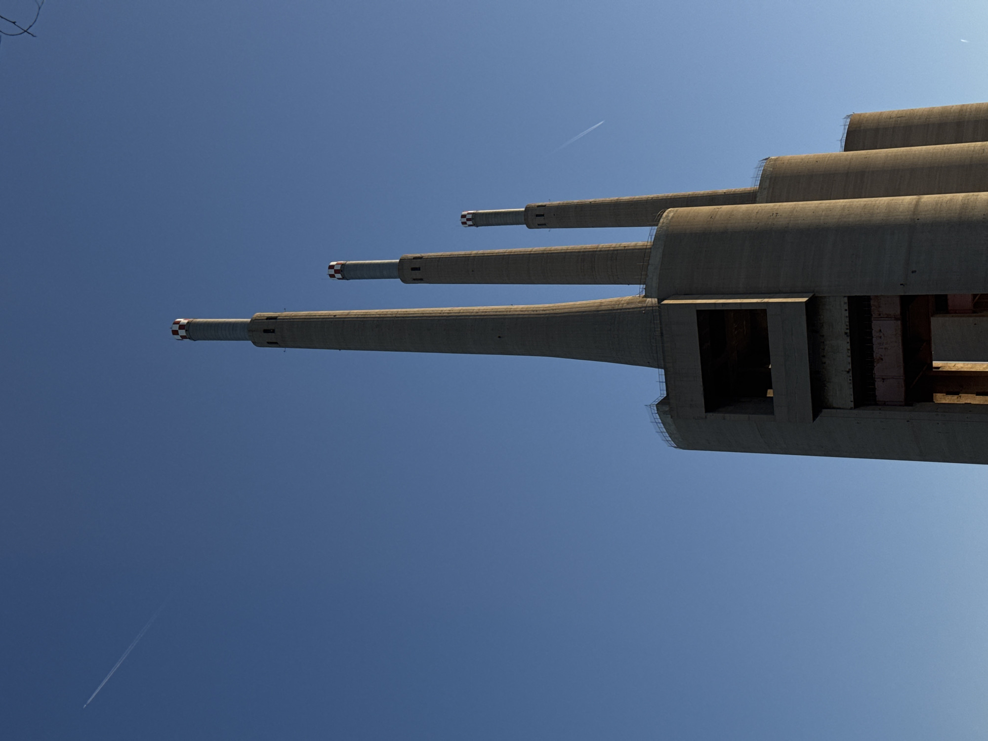 low-angle view of the Three Chimneys Power Plant in Badalona, Spain. The massive concrete structures dominate the frame against a clear blue sky. The chimneys are painted with red and white checkered patterns at the top. A faint contrail from an airplane is visible in the sky. The plant itself is partially visible, showcasing its industrial architecture and some internal structures.