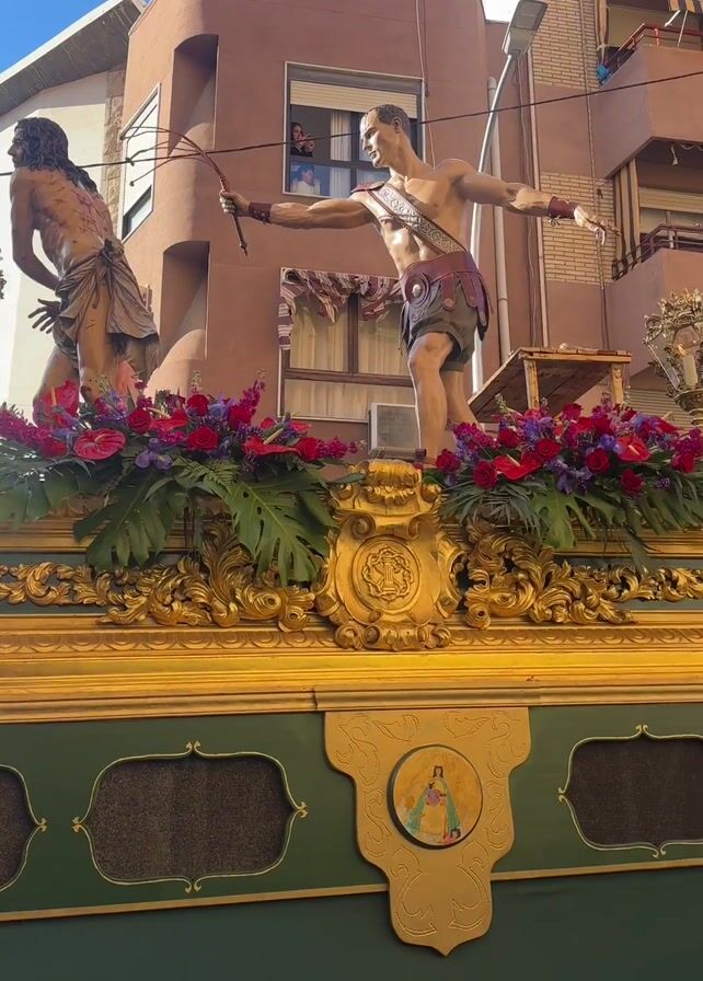 religious procession down a narrow street in Spain. The main focus is on an ornate float carrying statues depicting the flagellation of Christ. The float is decorated with flowers and gold accents. People are lined up on the sidewalks watching the procession. Some are visible on balconies above. Following the float are people in suits and band uniforms, and a young boy in a military-style uniform. The buildings lining the street are typical of a Spanish town, with a mix of residential and commercial properties. The sky is blue and the sun is shining.