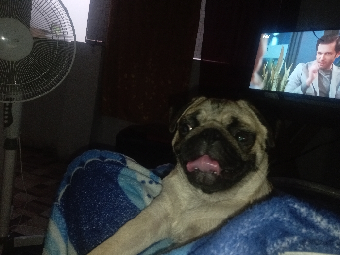 A pug rests on a blue and white patterned blanket, its tongue sticking out slightly. A white electric fan stands to the left. In the background, a television displays a man in a suit in a scene with indoor plants. The room appears dimly lit.