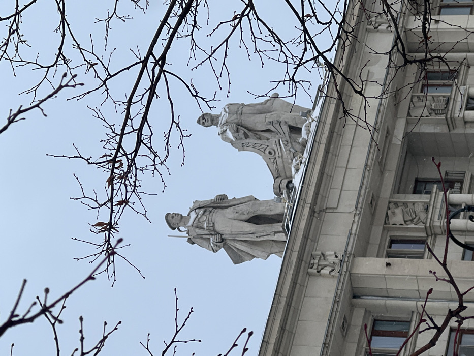 The image displays the upper section of the historic building located at Nevsky Prospekt 20, Saint Petersburg, Russia. Dominating the scene are two large, light-colored stone statues positioned on the building's roofline. The statue on the left depicts a standing male figure in what appears to be a naval uniform, complete with a peaked cap, a long coat, and a rifle slung across his back. He faces slightly right. To his right, a second male figure is depicted in a semi-reclined or seated posture, dressed in work attire, holding an indistinct object, possibly a tool or scroll. This figure appears integrated with a larger architectural element behind him, resembling a ship's prow or banner. Both statues have light snow accumulation on their heads and shoulders. The building itself is constructed from light-colored stone, featuring a prominent cornice and decorative architectural elements below the roofline, including stylized anchor motifs. Below the cornice, multiple windows are partially visible. The sky is overcast and uniformly light gray. Bare tree branches with visible buds or sparse dried leaves occupy the foreground, framing the building and statues from above and the sides. Some light snowfall is evident in the air and on surfaces. No active human interactions are depicted.