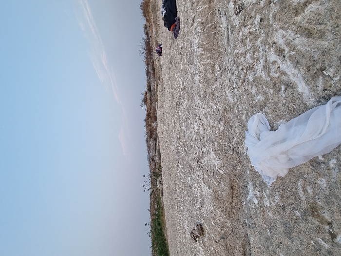 The image displays an open, arid environment in Kammavaripalli, India, under a clear, light blue sky with a faint, wispy cloud streak visible on the right horizon. The ground is a dry, uneven surface predominantly light brown and gray, characterized by widespread white patches consistent with mineral efflorescence or dried salt. In the immediate foreground, a crumpled white translucent fabric object rests on the ground. To the left mid-ground, a pair of brown sandals are visible. Further to the right mid-ground, a cluster of dark items, possibly clothing or bags, accompanies a distinct pink and purple object. The background reveals low, weathered rock formations and sparse, dry shrubbery along the distant terrain. No individuals are present in the scene, and no specific actions or interactions are depicted.