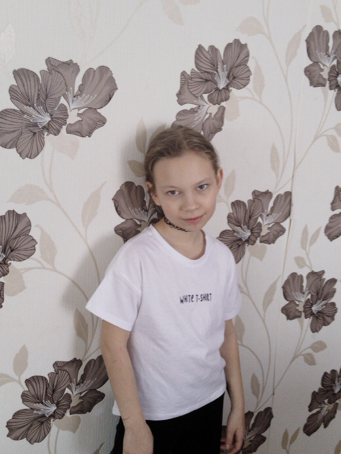 A young person stands indoors against a floral patterned wall. They wear a white t-shirt with the words "WHITE T-SHIRT" written on the chest. A black choker necklace adorns their neck. The wallpaper features large, stylized, grey flowers with white accents on a beige background. The person has light skin and blonde hair pulled back from their face. They are looking towards the viewer. The person wears black trousers.