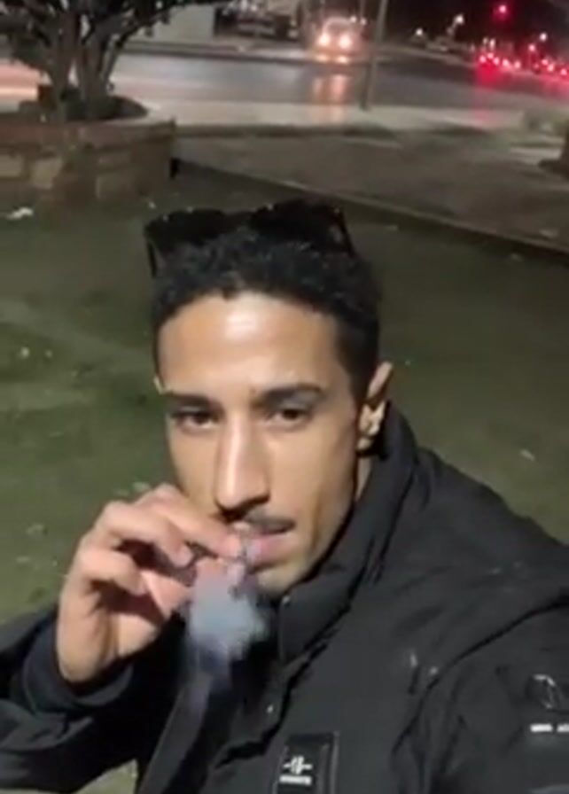 man smoking what appears to be a cigarette or similar roll-up outside at night