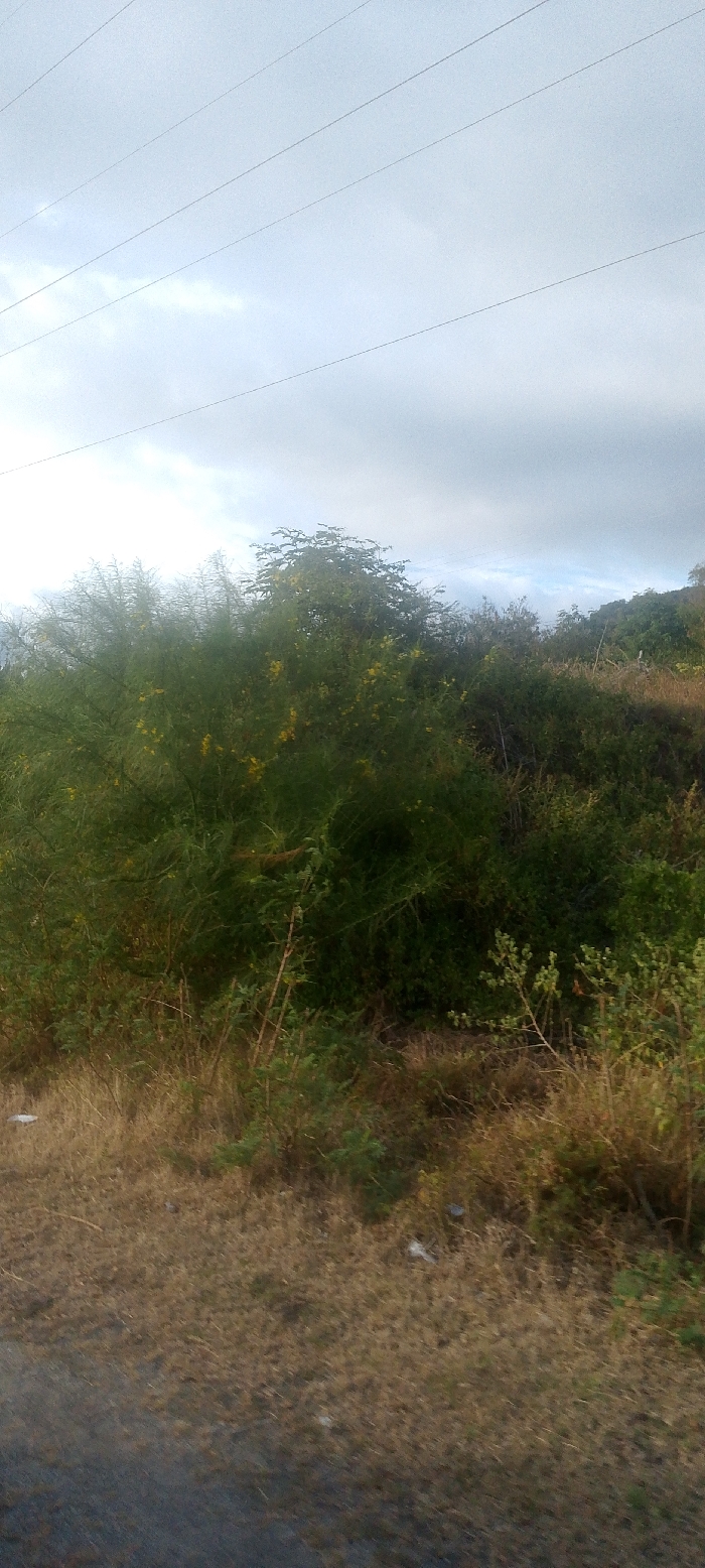 The image depicts an outdoor scene near Juan Griego, Venezuela, under an overcast sky. The upper two-fifths of the frame are dominated by a pale blue-grey sky with diffuse white clouds. Five thin, dark power lines traverse horizontally across the upper sky, angling slightly upward from left to right. Below the sky, the mid-ground is characterized by a dense mass of green vegetation, including bushes and trees, with scattered clusters of small yellow flowers visible within the foliage, particularly on the left side. The vegetation appears to be on a gentle slope or hillside, rising towards the right. The foreground consists of dry, straw-colored grass and exposed soil, with sparse green sprouts. The lower left edge of the frame shows a dark, indistinct surface, possibly a road or pathway. Small pieces of light-colored debris are visible on the dry ground in the foreground. No individuals or animals are present.