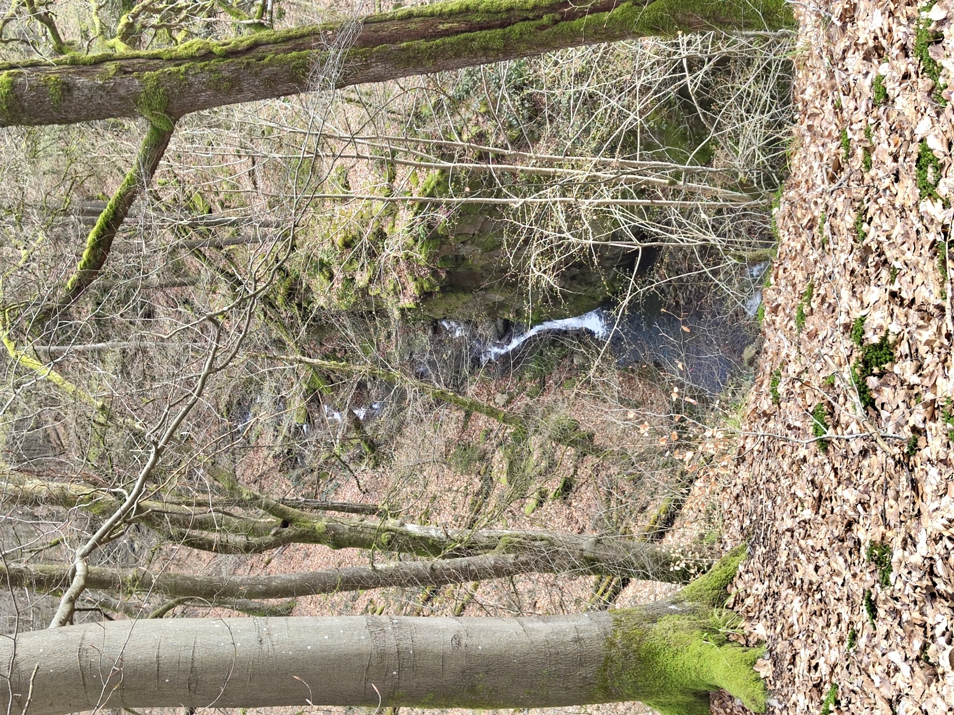 The image depicts a forested scene in Mettlach, Germany, likely a ravine or steep slope. A small stream or waterfall flows through the center of the frame, cutting through the landscape. Trees dominate the view, with moss-covered trunks and branches in the foreground and background. The forest floor is covered in fallen leaves. The branches are bare of foliage, suggesting the photo was taken during the late fall or winter. The perspective is from above, looking down into the scene.