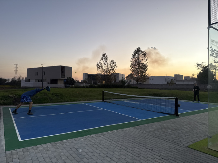 Two men are playing paddle tennis on a blue court with green bordering. The court sits in a green field with houses in the background, silhouetted against the sunset. One man is in the process of swinging at the ball and the other stands watching, holding a paddle. Paving stones surround the court on one side. A glass panel can be seen to the right. There are some trees and what looks like smoke in the distance.