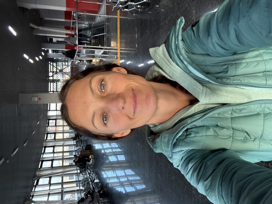 The scene is a public indoor space, identified as a transportation hub, located in the city of Petropavl City Administration, Kazakhstan. In the foreground, a woman is captured in a selfie-style portrait. She has light skin, blue eyes, and medium-length brown hair with visible grey strands, pulled back from her face. She wears a teal-green quilted puffer jacket over a mint-green hooded sweatshirt and exhibits a faint smile. The background reveals a large, well-lit area with a dark, highly reflective floor and a grey ceiling fitted with linear fluorescent lighting. To the left, multiple rows of grey metallic benches serve as a waiting area. Several individuals are visible: two seated on a bench further back, one with a dark bag beside them, and another partially visible figure on the far left. A wall of large, dark-framed windows provides natural light and a view of an overcast sky and building structures outside. To the right, a descending escalator or moving walkway is bordered by chrome railings with glass panels. Multiple individuals are observed on or near the escalator, moving away from the camera. Distinguishable figures include one person in a grey hooded jacket and another in a dark jacket. A red vertical wall section is present behind the escalator, and grey structural pillars with red vertical accents punctuate the space. The overall environment suggests a modern public transit facility.