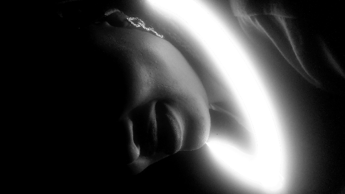This black and white image displays a close-up, low-light portrait of an unidentified individual. The location is not discernible from the image; recorded as Unknown, Unknown. One person is visible, primarily showing the lower portion of their face, including the mouth, chin, and right jawline, along with part of the right side of the neck and shoulder. The upper facial features are obscured by deep shadow. The individual's lips are slightly parted, revealing a hint of the tongue. A reflective, elongated, possibly jeweled earring is present on the visible right earlobe, appearing to be a serpentine or curvilinear design. Fabric folds, consistent with clothing, are visible on the lower right portion of the image, covering the shoulder. A prominent, bright, white semi-circular light trail encircles the individual's neck and chin, extending from the lower left of the frame towards the right shoulder. This light source selectively illuminates the underside of the chin, the jawline, and part of the neck. The background is uniformly black, providing no environmental context. The illumination is stark, creating high contrast between the lit facial features and the deep shadows that obscure the rest of the subject. The image captures a posed subject within a controlled lighting setup utilizing light painting.