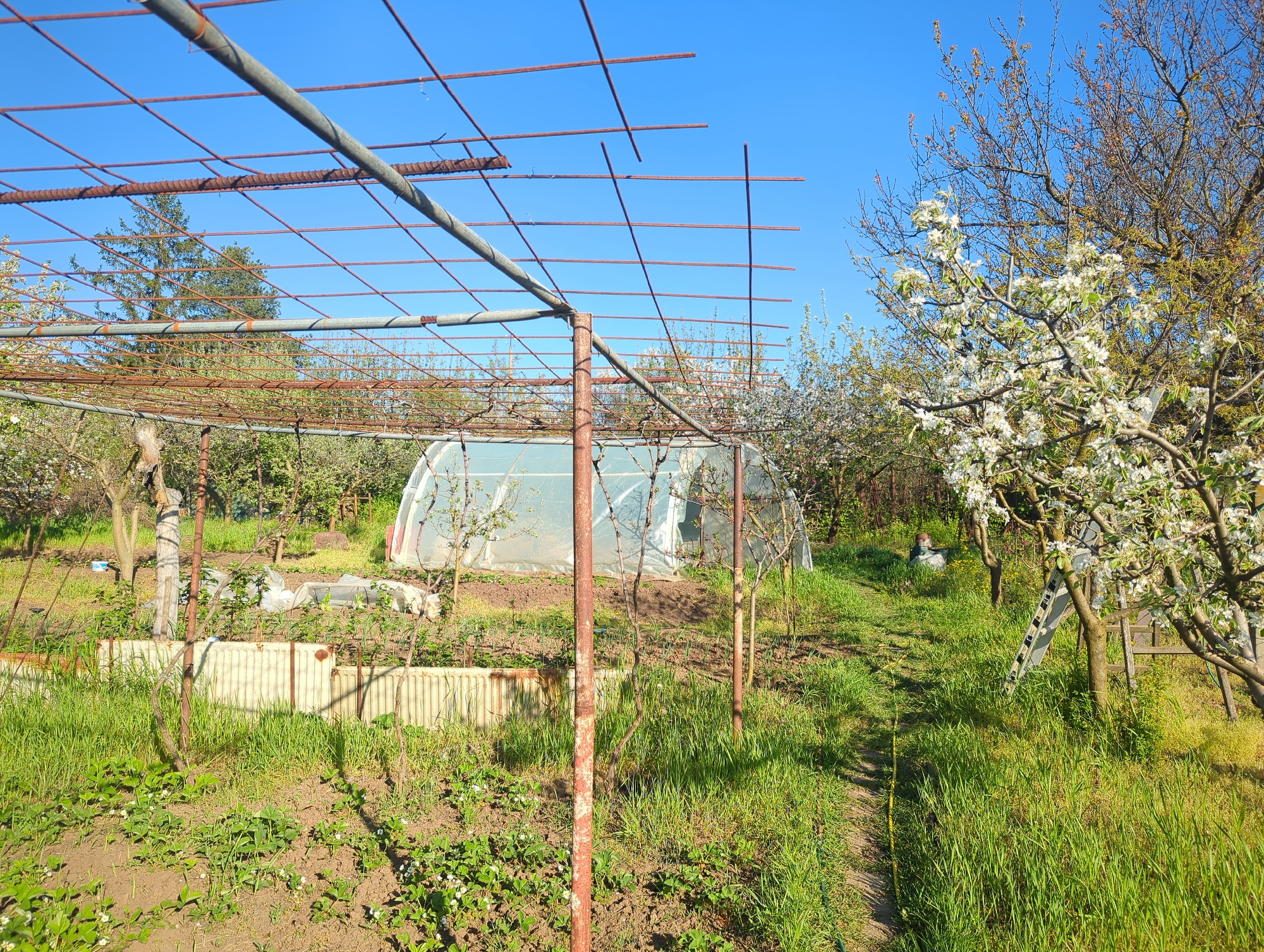 The image depicts a garden scene in Razgrad, Bulgaria, on a sunny day with a clear blue sky. The foreground shows cultivated soil with young strawberry plants with white blossoms. An aged metal trellis structure dominates the left side of the frame, likely intended for supporting climbing plants. Behind it is a low barrier or fence made of what appears to be old radiators. A greenhouse with a translucent cover is visible further back in the garden. Grass covers the pathway through the garden, with taller grass and blooming trees flanking the path on the right side of the image. A wooden ladder is leaning against a flowering tree. The overall impression is that of a rural or semi-rural garden setting within the city limits. There are no people visible in the scene.