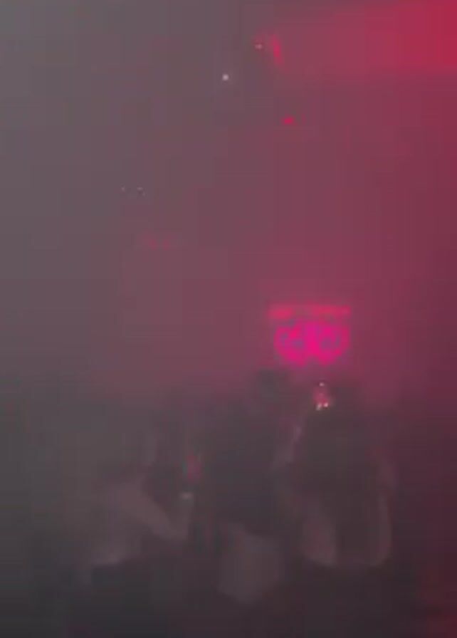 people dancing in a dimly lit nightclub environment, illuminated by red lights and a disco ball. A neon sign is visible on the wall. Many people are taking videos and photos. The club appears crowded with people enjoying the music and atmosphere.