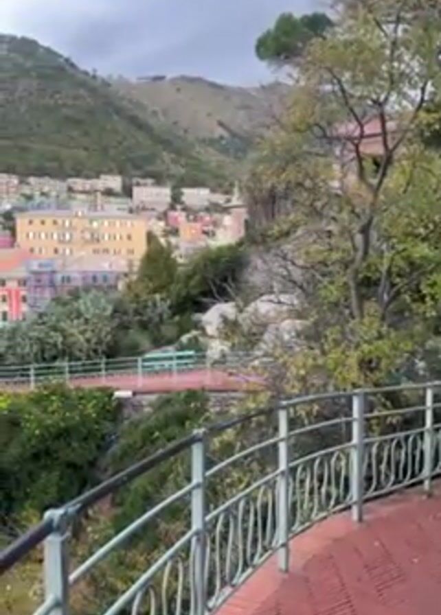 The camera pans slowly from right to left, revealing a town situated on a coast. The scene is shot from an elevated position along a walkway featuring a red herringbone-patterned brick surface and a light green railing. Trees and greenery line the side of the walkway. In the distance, a hillside densely populated with buildings painted in pastel shades of yellow, pink, and white is visible. Boats are docked along the water's edge. The sky is overcast, suggesting a cloudy day.