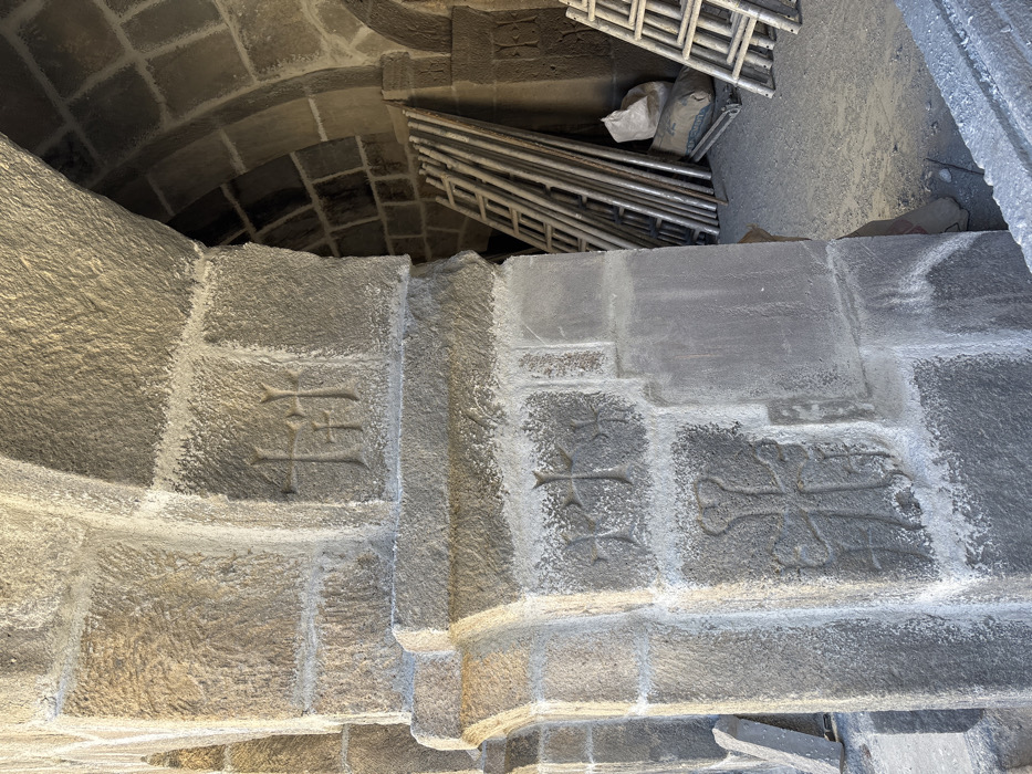 Stone arches, possibly part of a building interior, dominate the scene. Carved emblems adorn the stone, with one resembling a stylized tree or gate, and others appear as variations of crosses. Scaffolding materials are haphazardly stacked in the background, partially obscured by light dust. The stones exhibit a rough texture, and the overall lighting creates shadows that accentuate the carved details. White residue lines the edges.