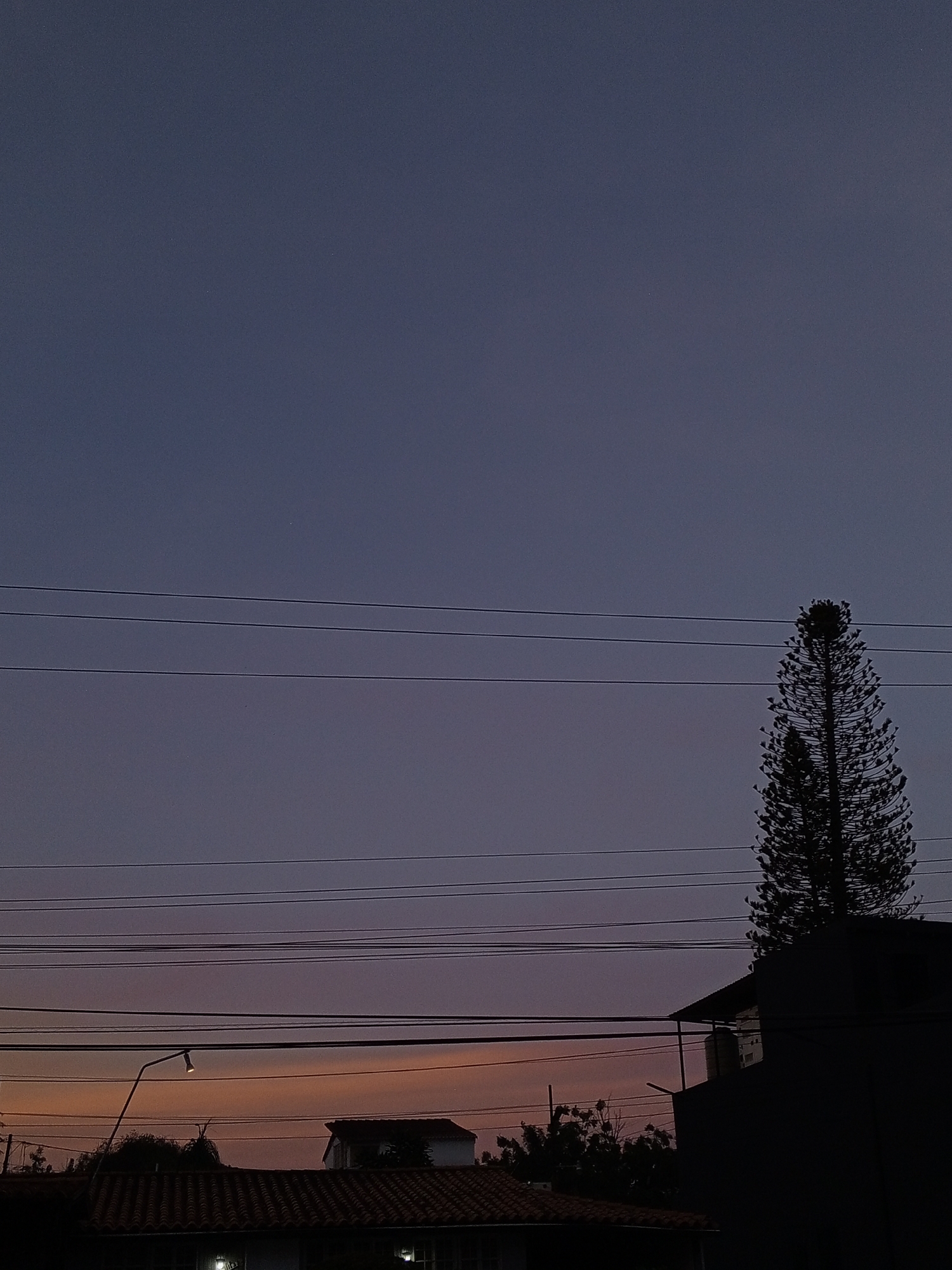The image depicts a twilight scene in an urban area, likely Pampatar, Venezuela, based on the prompt. The sky transitions from dark blue above to orange and pink near the horizon. Several parallel power lines stretch across the frame. Silhouetted against the sky are rooftops and trees. A tall, cone-shaped evergreen tree stands to the right. A street lamp is visible, emitting a faint light. Building roofs can be seen and appear tiled. A darker building is on the right of the frame. The overall scene appears peaceful and still, characteristic of dusk.