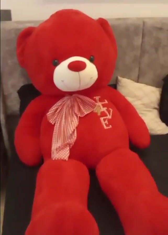 large, red teddy bear sitting on a bed