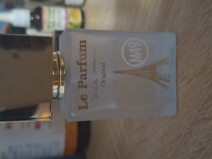 An upright, rectangular, frosted glass perfume bottle stands on a light brown wooden surface with visible grain. The bottle features golden lettering displaying "Le Parfum" prominently, followed by "Isabelle Milan" in a script font, and "Original." A golden outline illustration of the Eiffel Tower is visible on the lower left of the bottle's front, alongside a circular emblem containing the text "M49" to its right. The bottle is topped with a reflective, cylindrical golden metallic cap, beneath which is a matching golden ring. The background is out of focus, revealing blurred objects: a bottle with orange liquid partially visible on the left, and a smaller, dark glass dropper bottle with an illegible label on the right. The scene is static, with no human subjects or actions depicted. This image was captured in Selyanin, Bulgaria.