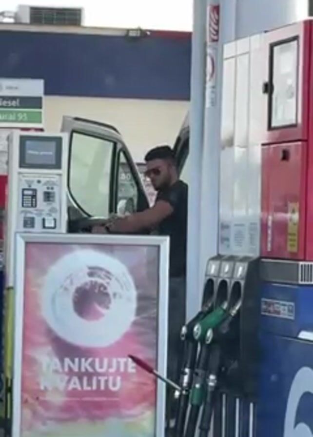 A medium shot depicts a gas station environment. A man with short dark hair, wearing sunglasses and a black t-shirt, is standing inside the open driver's side door of a white van. He's leaning on the steering wheel, looking down. To the left of the van is a gas pump kiosk with a screen and keypad. In front of the kiosk is an advertisement poster with the words "TANKUJTE KVALITU" (refuel quality) and an abstract design. To the right of the van are several gas pumps with green nozzles, next to a red metal utility box. The scene is brightly lit.