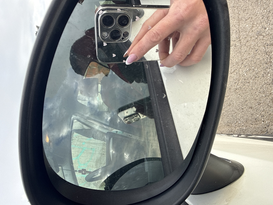 - "The image depicts a self-portrait captured in the black-framed passenger-side mirror of a white vehicle, parked in Petrovac na Moru, Montenegro, on an overcast day" by FM-ou9df1, licensed under CC BY 4.0