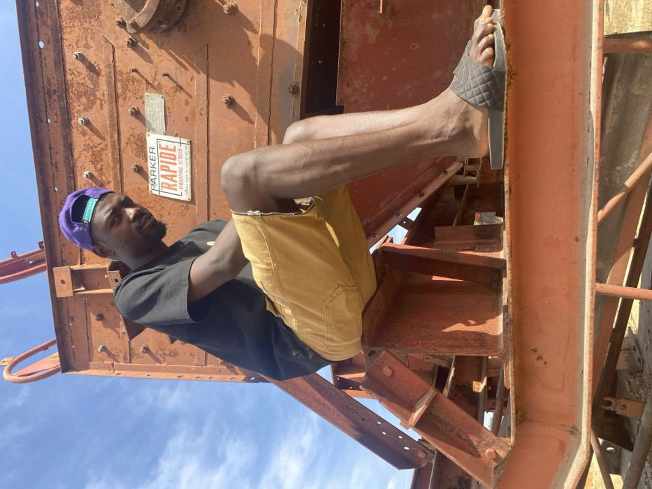 An individual is depicted seated on rusty, orange-red industrial machinery under a clear blue sky in Barakin Akawo, Nigeria