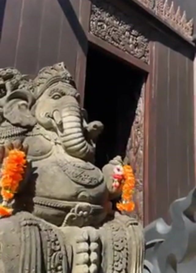 close-up of a stone Ganesha statue decorated with orange and white garlands, followed by a view of a dark wooden building with intricate carvings