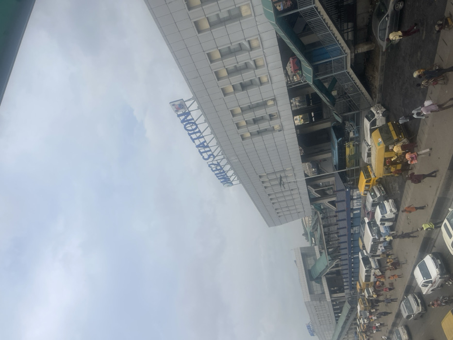 A street view shows parked cars, people walking, and yellow taxis. A sign reading "Mile 2 Station" is prominent on a gray building with a tiled facade. A pedestrian bridge structure is visible above the street. The sky is overcast with gray clouds.