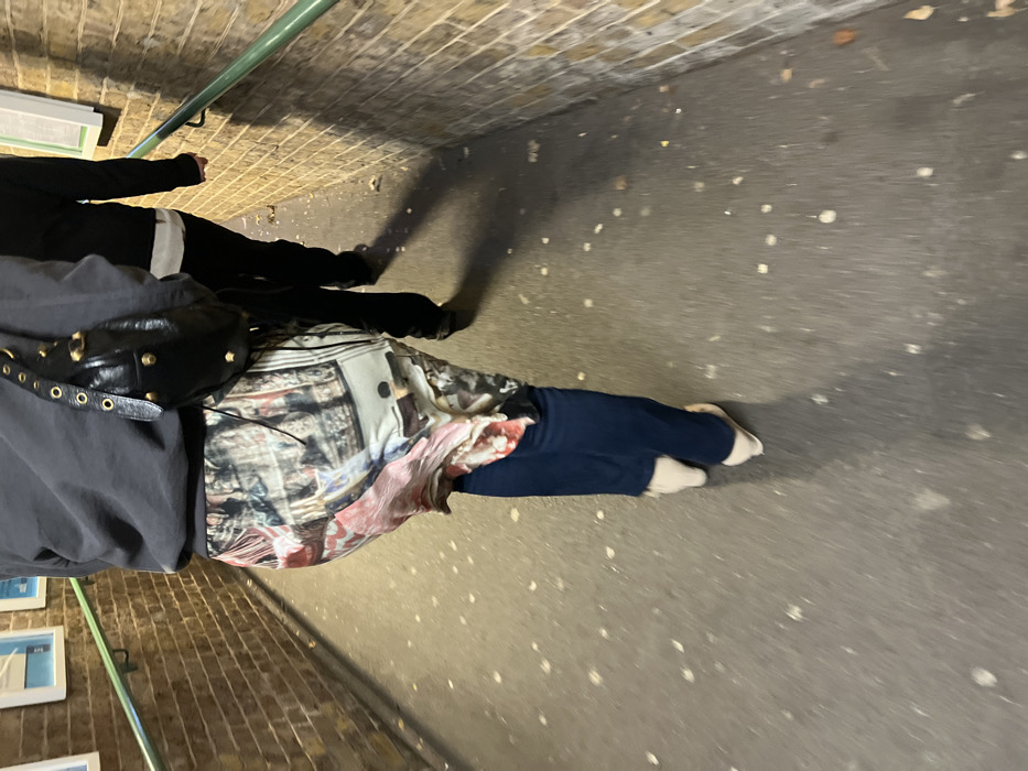A person wearing dark clothing with a black, studded purse stands on a gray concrete surface speckled with white spots. They are also wearing a patterned shirt with blue pants and white socks. Another person wearing black is slightly ahead. A green handrail is visible along a brick wall on the left. The wall behind them is also made of bricks.