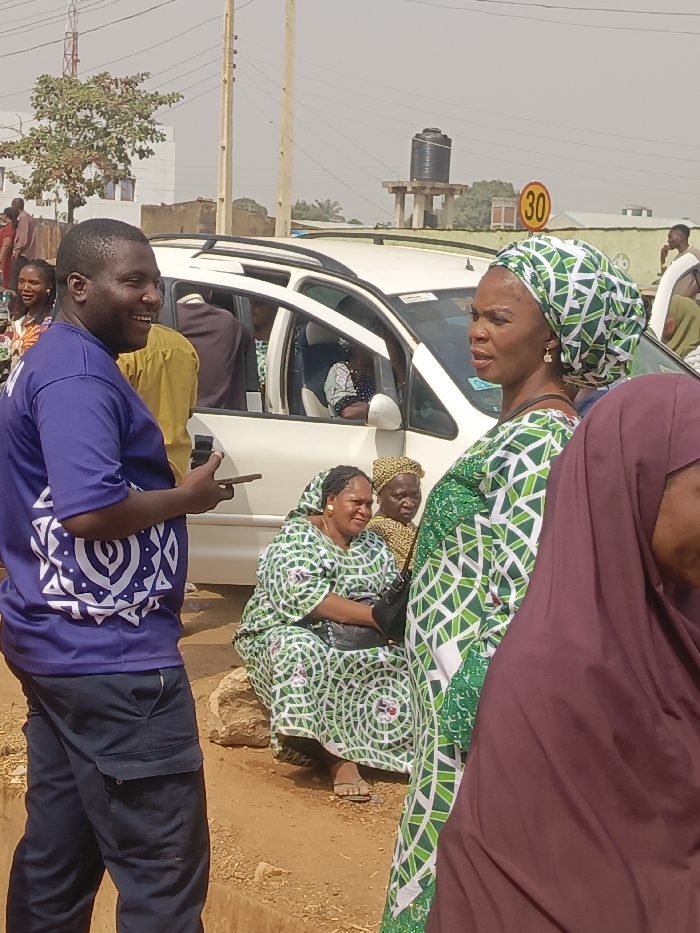 The image depicts an outdoor scene in Ube, Nigeria, under bright daylight conditions, likely a roadside or informal gathering area