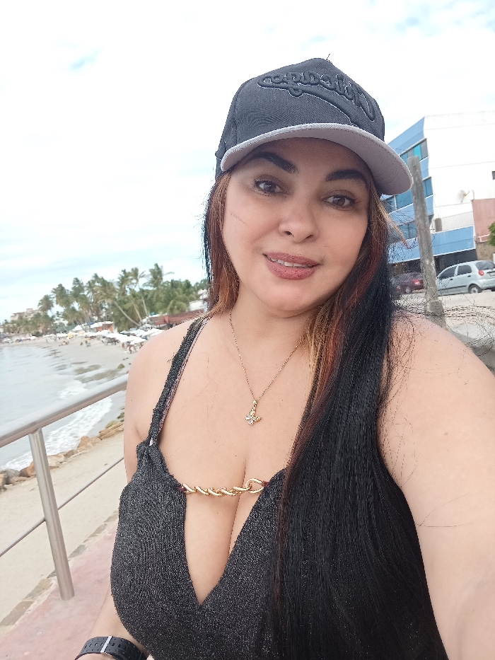 A woman in a black top and baseball cap poses for a photo. She wears a gold necklace with a butterfly pendant. The beach is visible in the background with palm trees and a building. The woman is wearing a black watch on her left wrist. She has long black hair, with hints of red in it. Her top has gold chain embellishments.