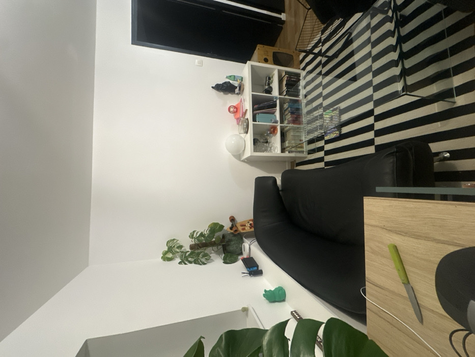 A minimalist living room features a white wall with a mounted black TV. A white shelving unit sits beside a black leather sofa, which faces a glass-topped coffee table. A black and white striped rug covers the floor. A houseplant partially obscures a side table. A smaller plant is on the shelf. Miscellaneous objects are scattered near the sofa, including a skateboard, and a green toy.