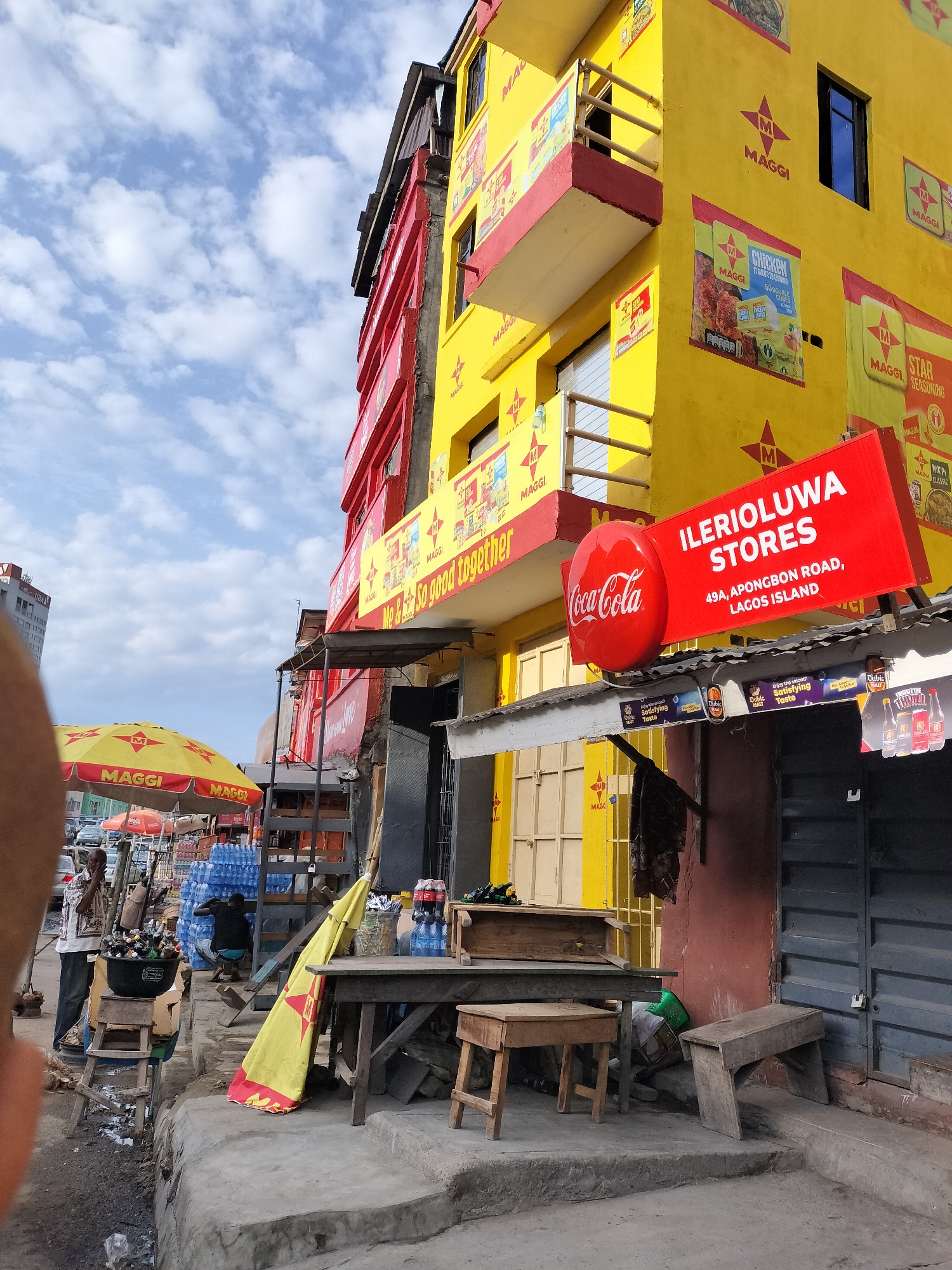 The image captures a street scene in Lagos Island, Nigeria. The foreground displays a street vendor selling bottled beverages under yellow and red Maggi-branded umbrellas. Several stacks of bottled water sit beside him. Further back, a red and yellow building dominates the background, plastered with Maggi advertisements. A red sign above the entrance reads "ILERIOLUWA STORES, 49A, APONGBON ROAD, LAGOS ISLAND" alongside a Coca-Cola sign. A wooden table with stools sits in front of the store entrance. The overall environment appears to be a busy commercial area.